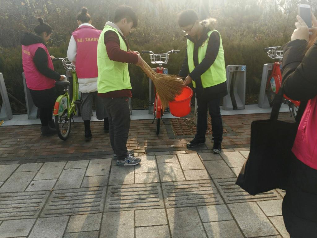 12月4日上午,志愿者们穿着统一的服装早早在志愿服务场地集合。志愿者首先对校园主干道及篮球场地进行了清扫,随后又将篮球架清理干净,天气虽冷,但大家却干的热火朝天。清洁后的篮球场变得干净整洁,焕然一新。随后,志愿者走出校门,沿路捡拾周边的垃圾,最后在校门口公共自行车停放处对公共自行车进行了擦拭,对周边进行清扫。