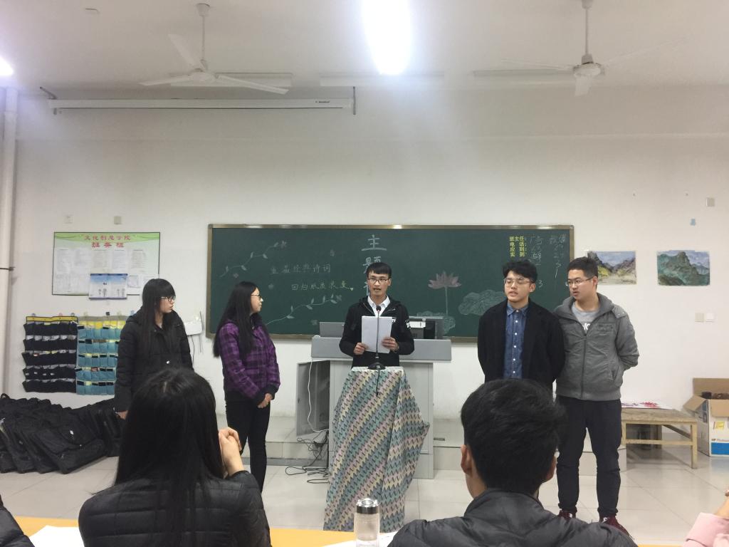 12月7日晚,文化创意学院举办主题诗会大赛。本次主题诗会旨在继承和弘扬中华民族的优秀文化传统,营造富有激情、富有青春气息的校园文化氛围,展现当代大学生的风采,提高学生诗歌的鉴赏能力。活动的开展得到了全院学生的积极支持和热情参与,参赛选手为同学们和评委们带来了一场完美的视听盛宴。同学们精神饱满、声音洪亮的朗诵赢得了阵阵掌声;同学们积极踊跃的诗句回答和同组人员相互默契的配合,使得赛场的氛围异常热烈。最终经过三个回合的你争我抢,决出获胜班级。