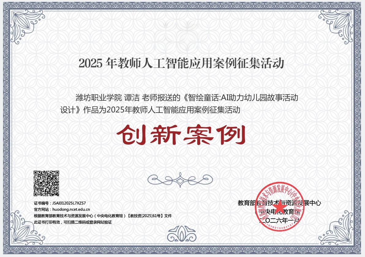 近日,教育部教育技术与资源发展中心(中央电化教育馆)公布了2025年教师人工智能应用案例评选结果。经多级遴选推荐,文化创意学院教师谭洁的《智绘童话:AI助力幼儿园故事活动设计》成功入选职教组的创新案例,体现了学院在人工智能与教育教学深度融合方面取得的显著成效。