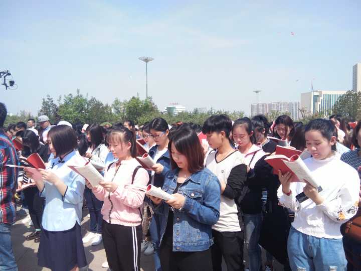 值世界读书日来临之际,4月23日上午,文化创意学院100余名学生到潍坊市人民广场参加了“京广读运会•千人诵读”活动。