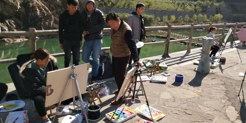 车行驶在盘山公路上,就像过山车一样惊险刺激。到达山脚下,同学们便开始向山顶进发。沿途美景如画,满满一树的山楂果红亮耀眼,峡谷里溪水潺潺动听,老师和同学们相互攀谈,都忘却了登山的劳累。同学们或组队登顶博览山顶美景,或三五成行支起画架开始作画。休息的间隙,同学们都会积极帮助当地的群众做一些力所能及的劳动,遇到肩挑重物的老人,男同学们也会主动接过老人身上的扁担。潍职学子的良好精神品质都在一言一行上体现出来,得到当地居民的赞赏。