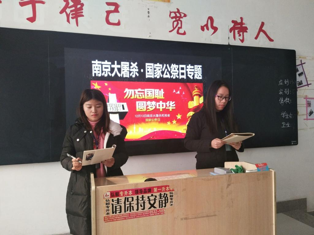 班会活动的第一个环节,全体师生庄严肃立,低头默哀,以寄托对三十万遇难同胞的哀思。接下来,班主任带领同学们重温“南京大屠杀”的历史,唤起同学们的爱国之魂。最后,学生代表发表倡议书,呼吁同学们不忘民族的悲痛、不忘历史的悲剧,勇于担当民族和国家复兴的重任。同学们纷纷表示,会积极践行“党的十九大报告精神”,努力做有担当、有责任的当代大学生,为实现中华民族伟大复兴的梦想而努力奋斗。