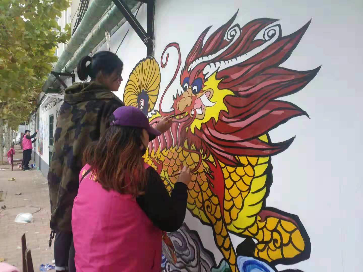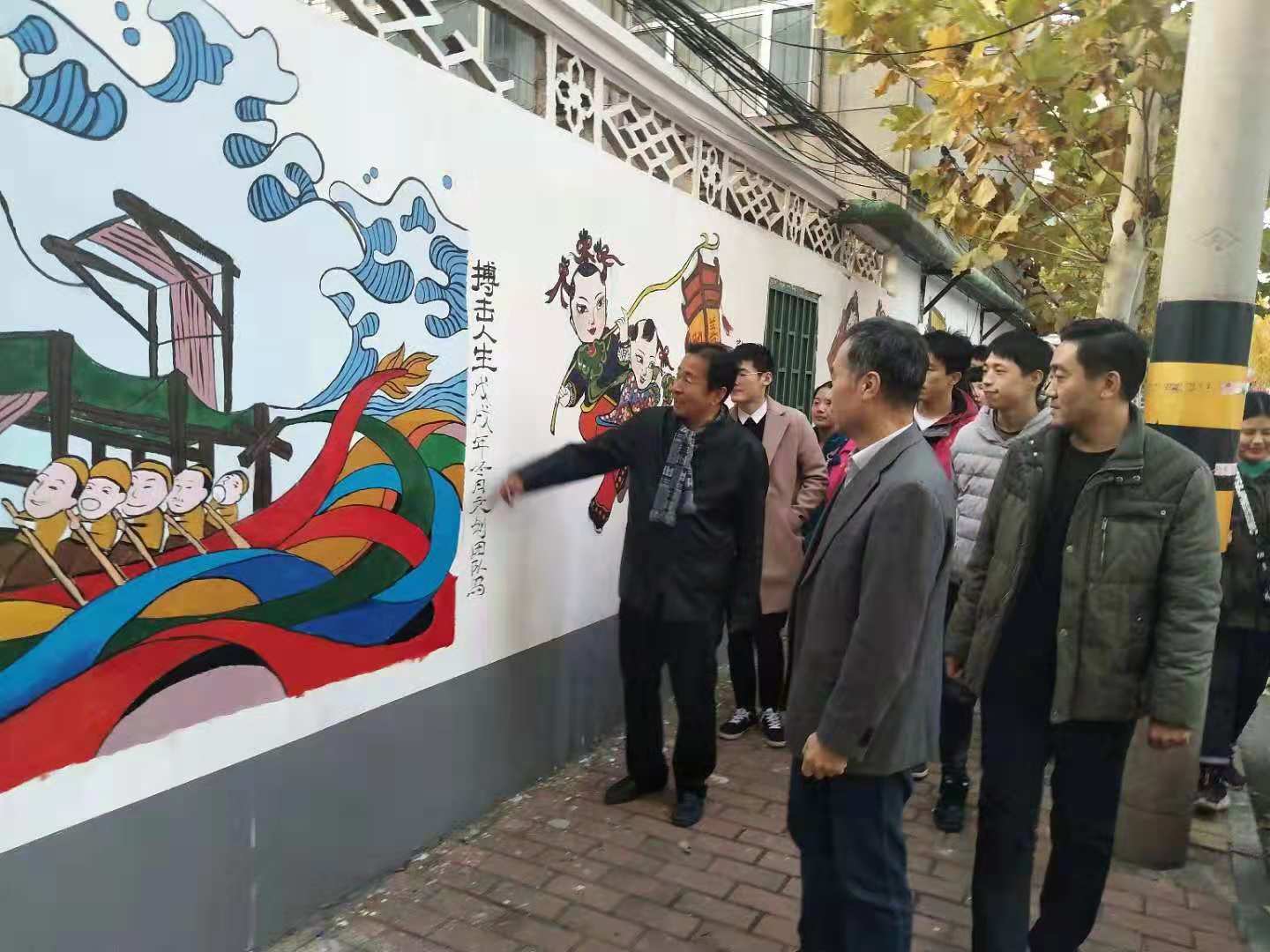 绘制期间,师生早出晚归,克服天气寒冷,认真绘制,在三百五十米长、两米五高的围墙上完成了“记住乡愁,守望精神家园——我的老潍县街巷,记忆、传承、创新”系列彩色墙绘作品,内容包含潍坊风筝、年画、老街及各种乡邻风俗画等。